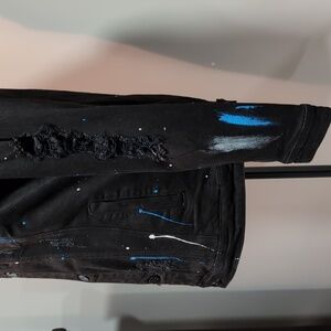 DNA, women's hand-painted stylish black denim jacket featuring unique distressed details and blue accents. Perfect for adding an edgy touch to any outfit.