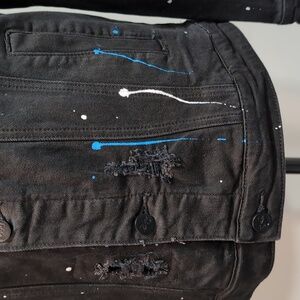DNA, Hand-painted Black Distressed Women's Denim Jacket with Blue Accents,Size S