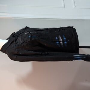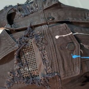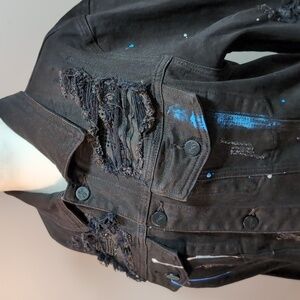 DNA, women's hand-painted stylish black denim jacket featuring unique distressed details and blue accents. Perfect for adding an edgy touch to any outfit.