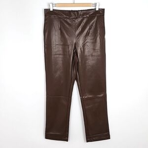 New without tags, DNKY Jeans women's in a rich brown faux leather straight leg pants with side pockets, an elasticized waistband and soft interior lining, size Medium.