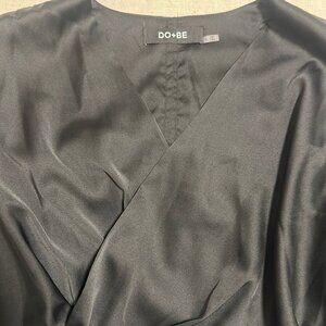 Chic and stylish, this lightly worn DO+BE cropped top in size large features a luxurious black silk fabric with a deep V-neckline, long sleeves with button details, and a small back opening for an elegant touch. Perfect for pairing with high-waisted pants or skirts for a sophisticated evening look.