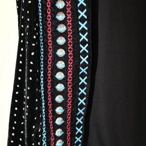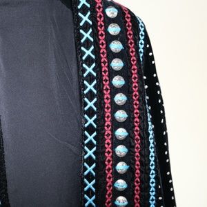 Crafted from plush velvet and embellished with vibrant embroidery and studs. Fully lined for a smooth fit. Can be worn with or without belt.