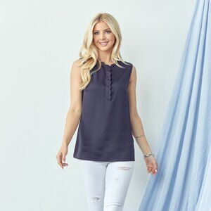 DOE & RAE Navy Scalloped Sleeveless Blouse, Elegant Work Top