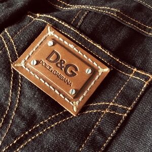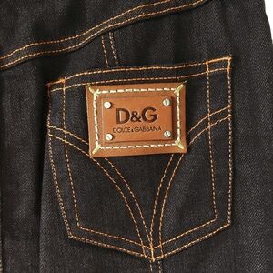 DOLCE & GABBANA Dark Denim Pencil Skirt. Irresistible Dolce & Gabbana sleek tailoring in an elegant figure hugging pencil skirt made of a slight stretch-cotton boasting a black colour. Features a front zip and button fastening, classic five pocket styling, contrast tan colour stitching, belt loops, leather logo patch, straight hem and back slit details. Adds glamorous chic appeal to your outfit. Pairs nicely with the Dolce & Gabbana Tie-Neck Bow Chiffon Blouse, also available as a separate item in my closet.