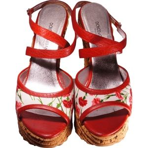 Dolce & Gabbana white and red canvas platform wedge sandals with leather trim, floral print throughout, sculpted cork heels and silver-tone buckle closures at wraparound ankle straps.