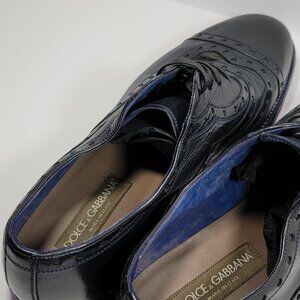 These Dolce & Gabbana men's dress shoes in a solid purple color feature a closed toe and lace-up closure for a stylish and secure fit. Made in Italy, these vintage Derby shoes are crafted from high-quality leather with lace and logo accents for a sophisticated touch. The lightweight design, cap toe, and comfortable leather lining and insole make them a limited edition piece perfect for any season.