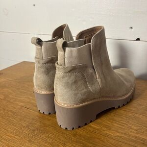 Chic taupe suede platform boots by Dolce Vita. Modern Chelsea-inspired design with elastic sides and chunky lug sole for comfort and stability. Never worn — small mark on suede (see photo). A stylish neutral piece perfect for fall and winter looks.