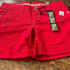 BRAND NEW WITH TAGS ‘’DOLLHOUSE ‘’ RED .. TWO BUTTON UP WITH SHORT ZIPPER SHORTS . TATTERED IN COUPLE SPOTS FOR NEW LOOK . TWO POCKETS IN FRONT .. TWO POCKETS IN BACK .. BLUE JEAN TYPE MATERIAL BUT HAS STRETCH TO IT ..TAG ON BACK WITH DOLLHOUSE ON IT YOU CAN LEAVE BUT HAS ALL TAGS ATTACHED NEVER WORN . DONT MISS THIS PAIR OF HOT LOOKING SHORTS