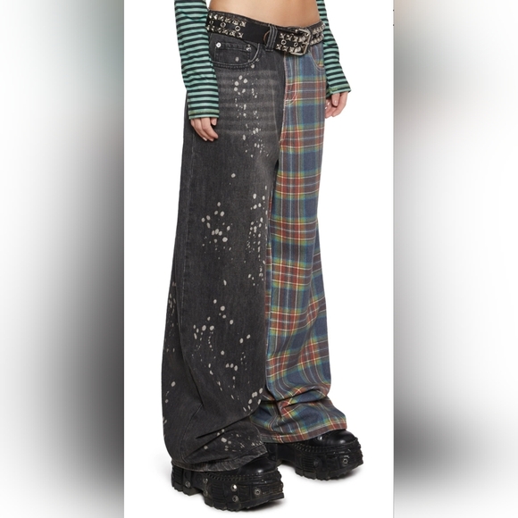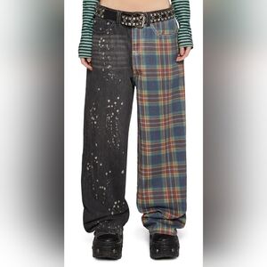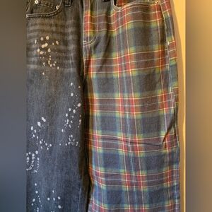 Unique two-tone jeans with a mix of black denim and colorful plaid.