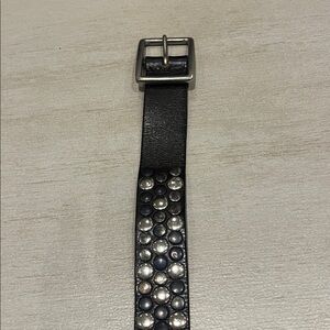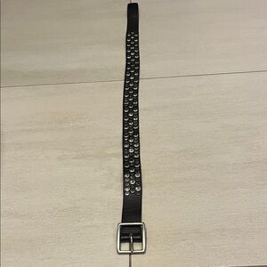 DOMA women’s black leather belt. 1 1/2” wide, size M (approx 40.5” long) with silver tone buckle and black and silver tone stud detail.