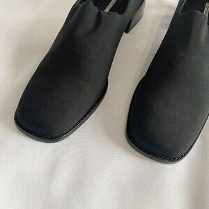 DONALD J PLINER BLACK MICROFIBER SQUARE TOE BLACK HEEL SLIP ON SHOES, made in a super stretch and soft microfiber, this is the perfect middle ground between formal chic and comfy relax with a heel yet low land in a block style for stability - square toe for a vintage yet contemporary touch - slip on for a quick and easy put on look - elastic upper that mold your upper feet perfectly - day to night work / business / office to dinner in a restaurant shoes - mature and classic.