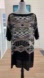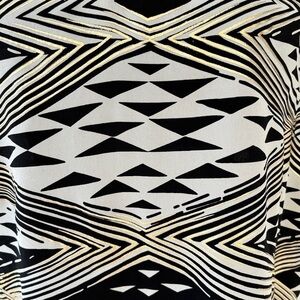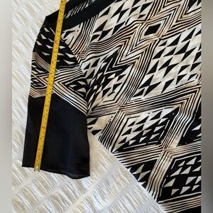 100% silk Donna Karan New York tunic is lightweight and on the sheer side. Geometric pattern on the front and back in off-white, black and metallic gold colours. Boatneck. Half sleeves. Slits up both sides. This looks great over slim pants or leggings. Wear to the office then out for the evening.
