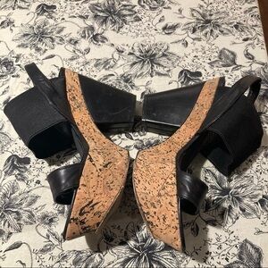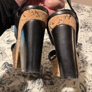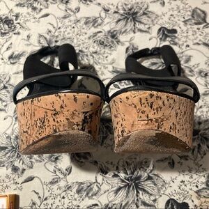 DONNA KARAN Sz 37.5 Funky Chunky Heel Platform Strappy Leather & Elastic Sandals. Fun sandals for Spring and Summer. Make a statement in these elegant yet funky sandals. Heel: 4” Platform: 2”