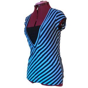 DOUBLE - FANG - Aqua Deep V neck loose - Striped V-Neck Women's Top - Medium