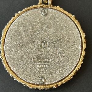 A bold and symbolic statement from D’Orlan, this mid‑century vintage mixed metal necklace from the 1970s features a striking circular medallion with a raised silver‑tone crab at its center, framed by a golden sunburst. It unmistakably represents the zodiac sign Scorpio—intense, intuitive, and fiercely protective—making it a striking talisman or decorative centerpiece.