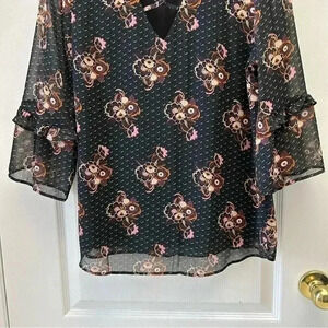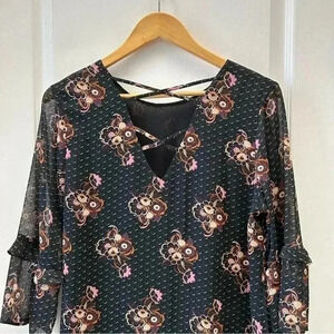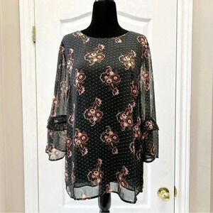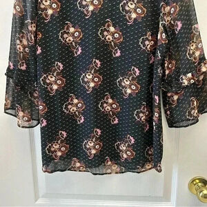 DR2 Blouse Sheer Ruffle Sleeve Bohemian Dark Floral Flowy Black Brown Small