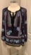 This shirt has it all, boho style, with florals and a deep navy colour. Shirt is sheer and bodice is two layers with sleeves being one layer of fabric. Sleeves are elastic cuffs, and tie up has tassels. Great dressed up or dressed down. Like new, only wore once as it was too big on me.