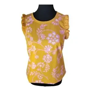 A lightweight woven tank top features ribbed trim with dainty ruffles for trendy style.