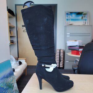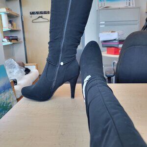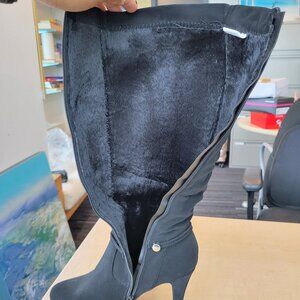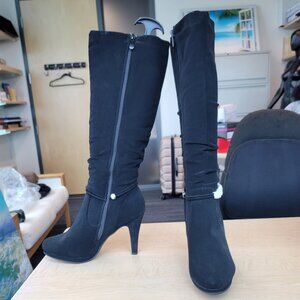 NWOT Be warm and stunning with these adorable knee high heel boot! Featuring leatherette upper, rhinestone buckles, Stiletto heel, stitching detail, striped lining, faux fur interior/insole, and finished with cushioned insole for comfort.