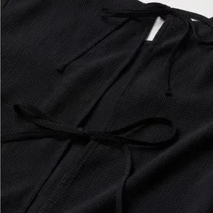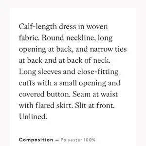 Calf length. Ties in back. Excellent wardrobe foundation piece. Many ways to style. Looks great with a blazer for work or with a sweater or tunic over top, a belt, boots, and leather or denim jacket.