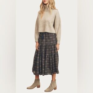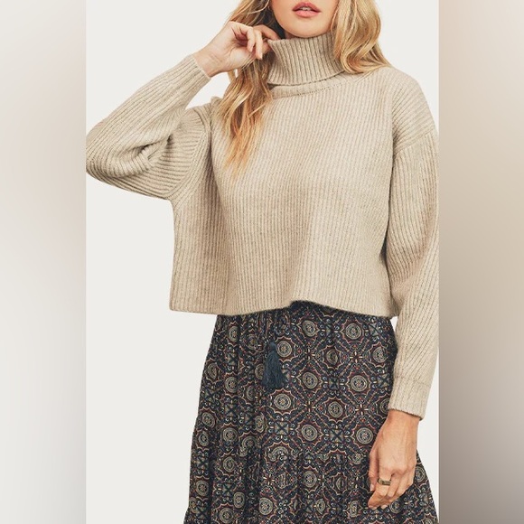 DRESS FORUM sweater is made from ribbed-knit in a neutral 'Oatmeal' hue that will pair well with virtually everything in your closet. It has an oversized fit enhanced by dropped shoulders and a cozy turtleneck. Slightly cropped. Color is Oatmeal