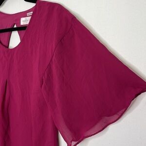 In great condition. 100% polyester made in USA. Sheer flowy sleeve. Completely lined. Cut out detail on the back. Measure lay flat: shoulder 19'' bust 16,5'' waist 16'' hips 17,5'' length 31,5''.