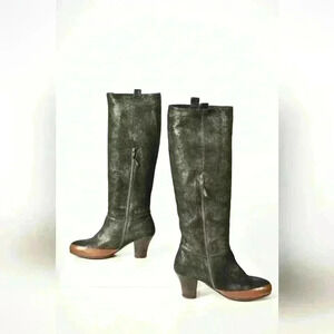 DRIES VAN NOTEN Emerald Green Distressed Metallic Leather Mid Calf Boots 9US
