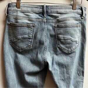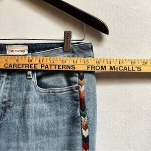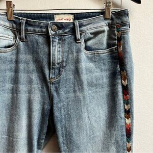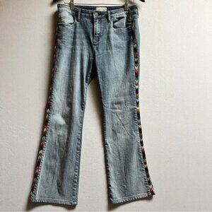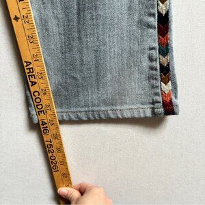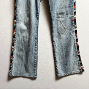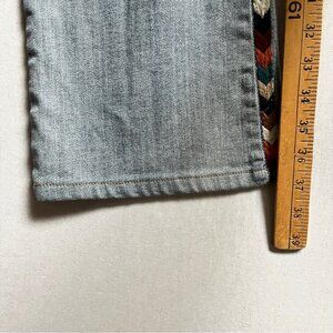 Stylish gray jeans with a subtle flare. Features unique, colorful embroidered side detail. Perfect for casual wear.