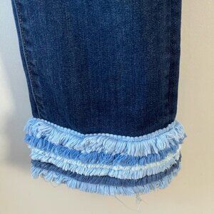 Ankle cropped slight flare jeans with a blue ombré layered fringe detail at the ankle with a raw hem .