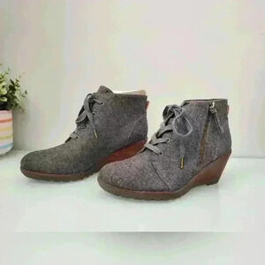 Brand new, never worn wool grey wedges. Brown 3 inch wedge. Lace up and side zip closure. They are Dr. Scholl's so, of course, they are super comfortable! size 8m