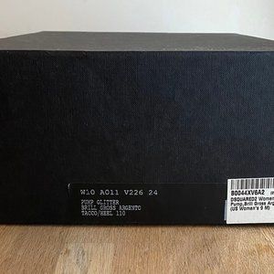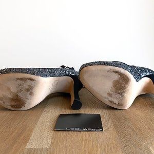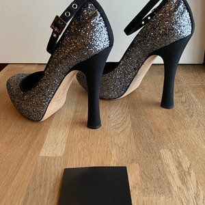 Still in the box, worn once for 4 hours... Silver glitter with hidden platform, ankle strap. Heels are HIGH; 3" - 4.5".