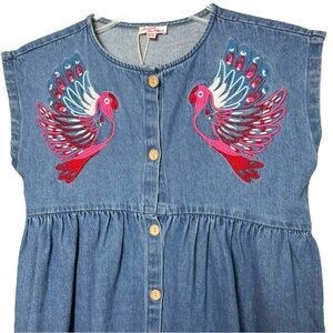 Excellent condition, like new Denim with bird embroidery Buttons up the front (comes w extra button) Mini length 100% cotton Girl’s size 10, 140 cm Chest (ptp) 18” Length 29”
