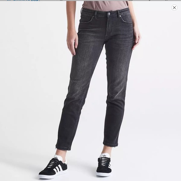 These slim-relaxed fit DUER Performance Denim Girlfriend Jeans for women feature a mid rise with a slightly tapered leg that sits above the ankle.