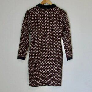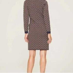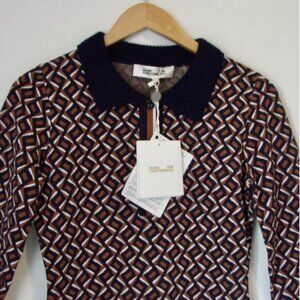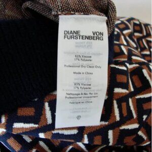 - gorgeous high quality designer dress by Diane Von Furstenberg features a navy blue, camel brown and white zig zag jacquard pattern with a polo ribbed