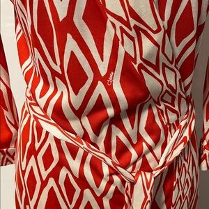 NWOT DVF 100% silk signature wrap dress with bold geometric pattern. Long sleeves and tie waist. The base color is cream with the design in a burnt orange. Quarter sleeve and long midi style. Perfect for versatile styling even in the winter with cognac coloured knee high boots. I love this dress so much but never wore it because I changed my color palette to neutral colors. I am dying to get my hands on another neutral wrap dress from DVF! 100% silk dry clean.