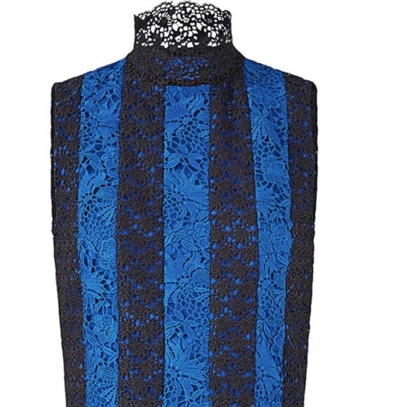 DVF lace crop top. sleeveless in royal blue and black lace. high lace neck. front is lined back it seems through. Size 10. New with tag.