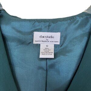 D.W. Studio by David Warren New York dark green silk blouse has wide collar, pleated detail around waist, and covered button front closures. Long sleeves & peplum are sheer/unlined. Body of blouse is lined. 100% silk outer fabric, lined in 100% polyester. Dry clean only. Made in China. Women's size "12", see below for garment measurements. Good pre-owned condition, bottom point of right front peplum has two small dots on the fabric. The pictures show the actual item that you will receive.