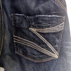 5-pocket stretch denim Dylan George jeans in 98% cotton, 2% Lycra. Dark-blue wash (ring-spun denim), flare leg, regular rise, embroidered pockets. Tagged size 26 with the following measurements: