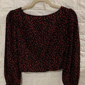 DYNAMITE BLACK RED TOP BLOUSE | LONG PUFF SLEEVE | SLIGHTLY CROPPED | PATTERNED