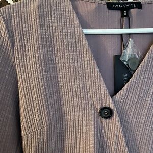 Features pullover design, ribbed body, stretchy fabric, sewn in button down front, V line neck