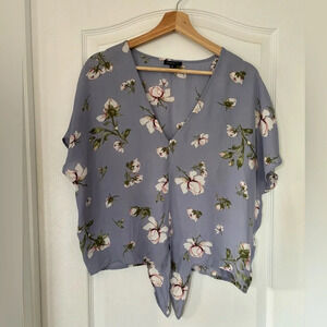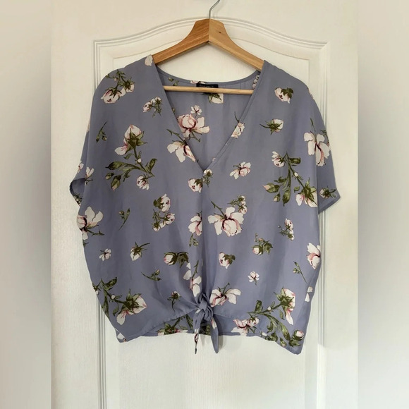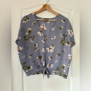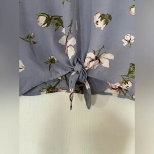 Charming periwinkle top, featuring a delicate floral pattern that exudes elegance and femininity. Front tie for adjustable and flattering silhouette!