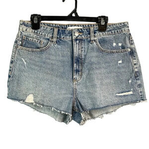 Women’s blue medium washed denim Dynamite High Waist Distressed Cutoff Jean Shorts.