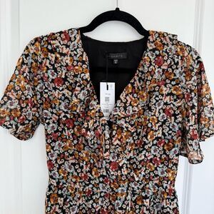 Floral pattern, featuring short flutter sleeves and a ruffled hem. Ideal for any outing.