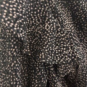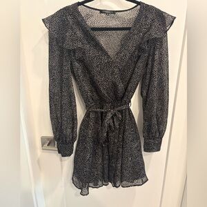 Chic and flattering black speckled wrap-style dress from Dynamite. Features a feminine V-neckline, long semi-sheer sleeves, and a self-tie waist that cinches perfectly for an effortless silhouette. The lightweight, flowy fabric makes it ideal for day-to-night wear.