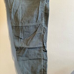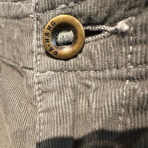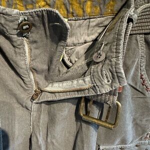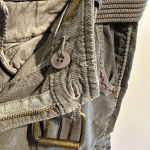 Chic straight leg pants in corduroy gray. Features removable belt and pocket details. Ideal for casual outings.
