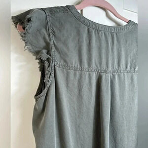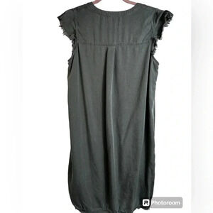 Awesome khaki dress, falls above the knees, with cap sleeves, and a relaxed fit. A 100% tencel means the dress has structure but is soft & fluid. The raw edges at the sleeves & bottom hem add a cool vibe. Excellent preowned condition