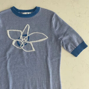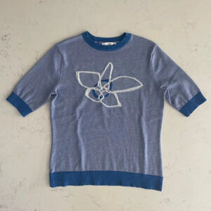 Daily Thread Short Sleeve Crew Neck Knit Sweater Top in Duotone Blue + White Playful Abstract Floral Graphic NWT