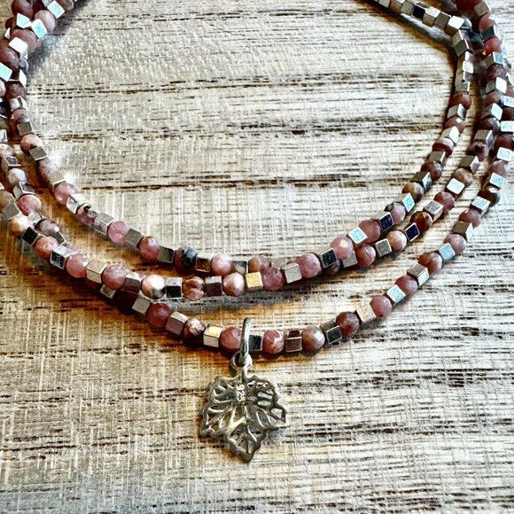 Dainty Peach Sunstone & Silver Hematite Wire Wrap Bracelet w/ Maple Leaf