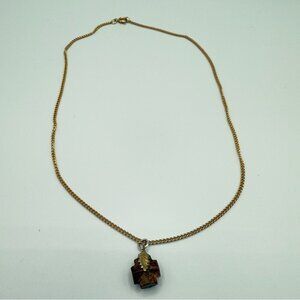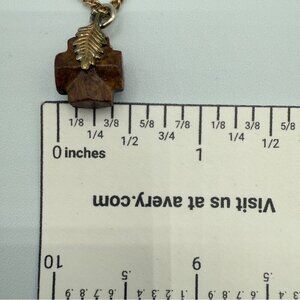Mini wooden cross pendant with goldtone leaf hardware on a gold tone chain with spring ring closure