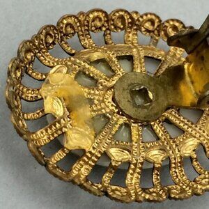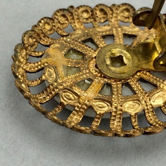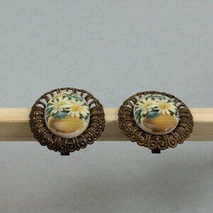 Metal Filigree Framed Clip On Earrings with Plastic Daisy Cabachons